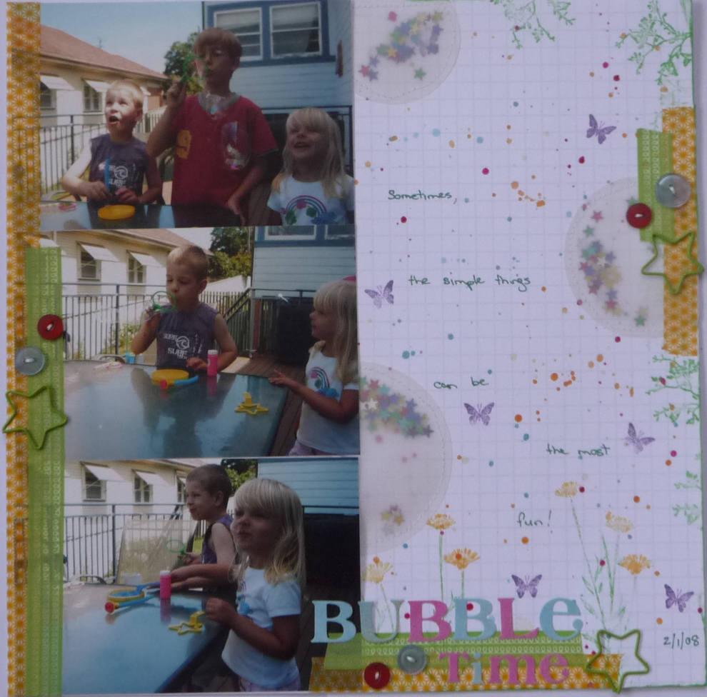 Can you see the vellum? It is matting the photos, giving a subtle distinction between them and the busy papers, as per this link. I forgot to take a close-up photo showing you the little stars, but they are scattered across the page from bottom left to top right.